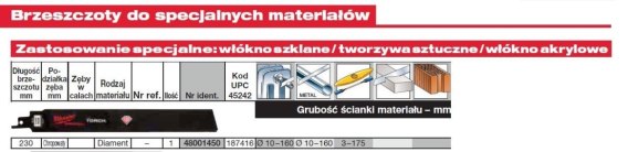 Milwaukee brzeszczot do piły szablastej 230mm chropowaty ząb 1szt. Włókno/pcv/akryl 48001450